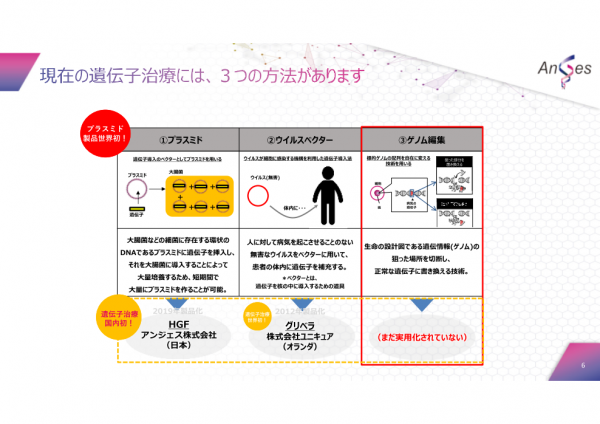 現在の遺伝子治療はプラスミド、ウィルスベクター、ゲノム編集の3つからなります。私たちのHGF遺伝子治療薬は、世界初のプラスミド製品となりました。(中略)そして、病気の遺伝子から正常な遺伝子へ一度の治療で可能となるゲノム編集は、究極の遺伝子治療であると考えております。ゲノム編集に関しては医療分野ではまだ実用化はされておりません。私たちはこのゲノム編集分野で世界のトップを狙うために、エメンド社に資本参加しました。