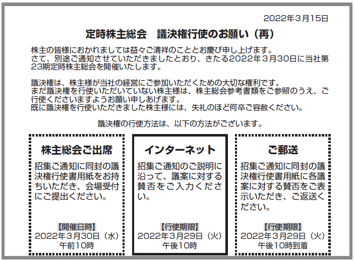 本日、株主(2021年12月31日時点)の皆さまへ、「定時株主総会 議決権行使のお願い」をお送りしておりますので、ご確認いただきますよう、よろしくお願い申し上げます。