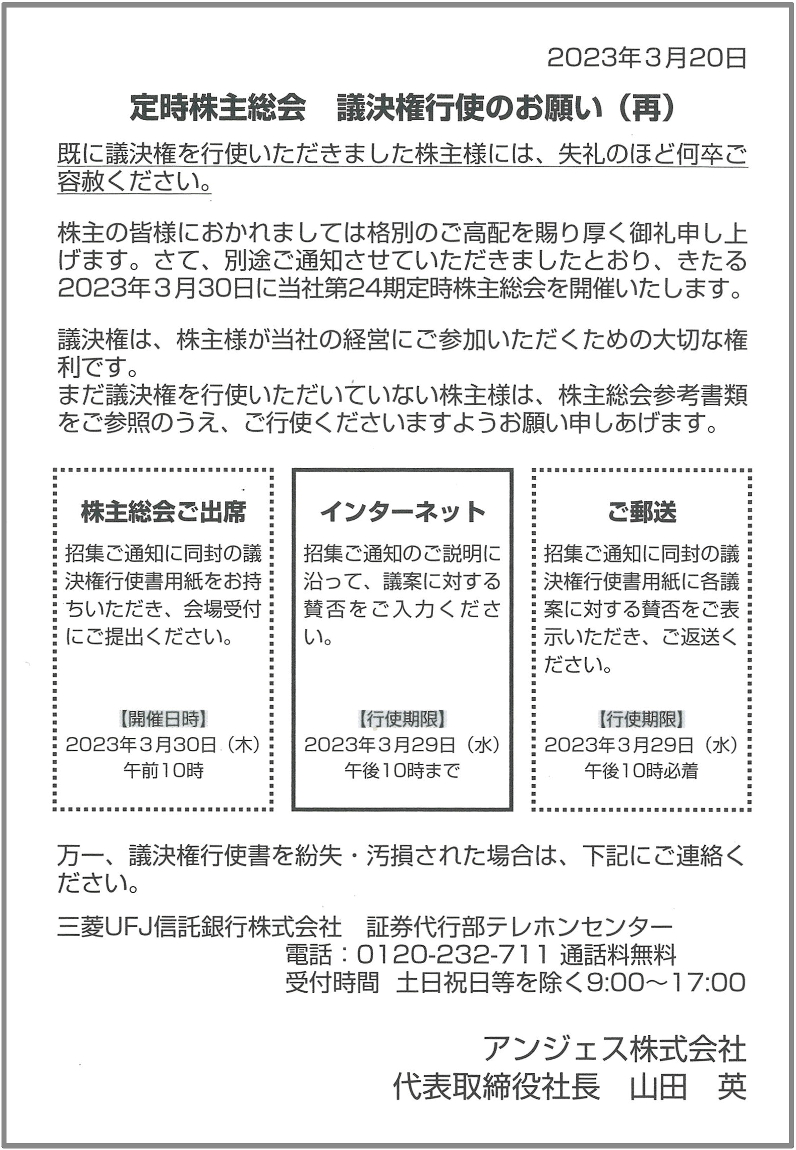 昨日、2022年12月31日時点の株主の皆様宛に、「定時株主総会 議決権行使のお願い(再)」のはがきをお送りしております。