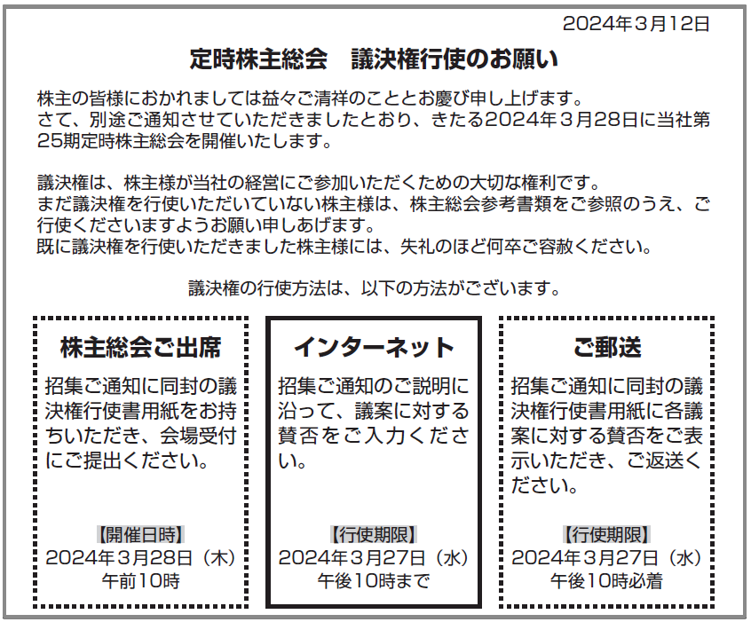 つきましては、本日、2023年12月31日時点の株主の皆さまに、「定時株主総会 議決権行使のお願い」をお送りしております。
